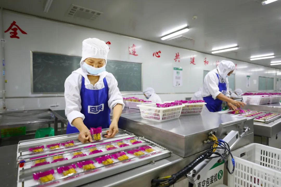 2022年7月5日,重庆市梁平区奇爽食品有限公司,工人在对预制菜产品进行真空包装。图/中新社发 刘辉 摄